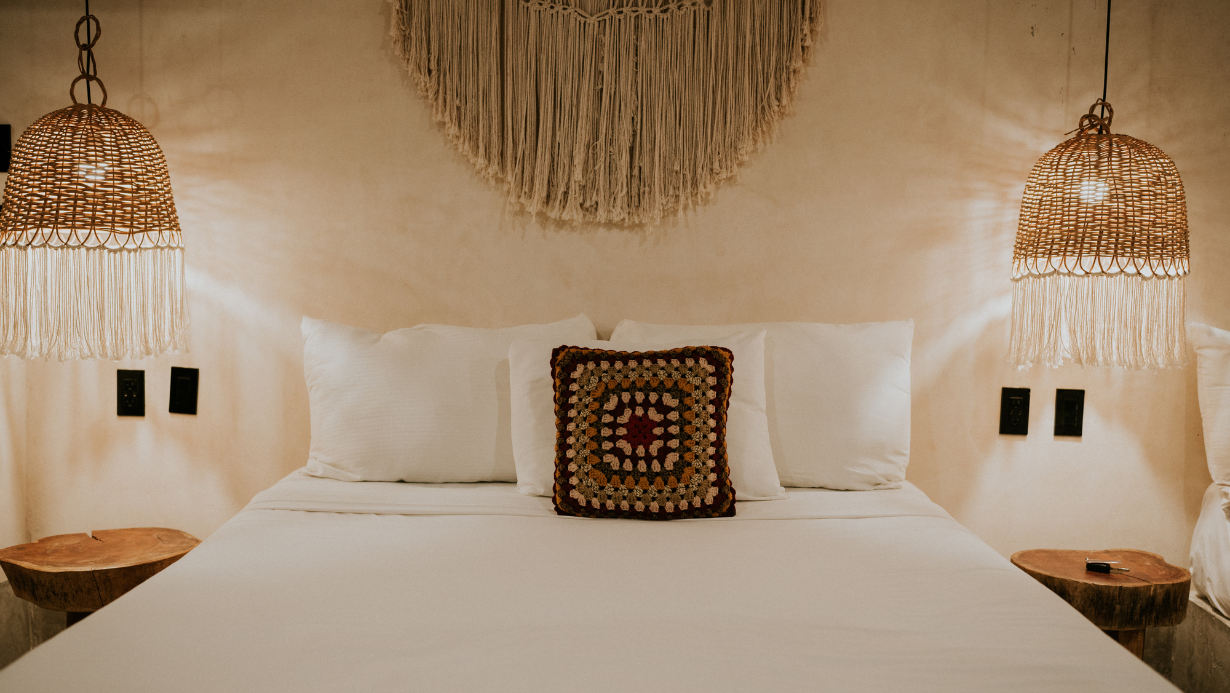 - Deux tabourets recouverts de macramé en guise de tables de chevet et deux lampes tempête pour les luminaires.