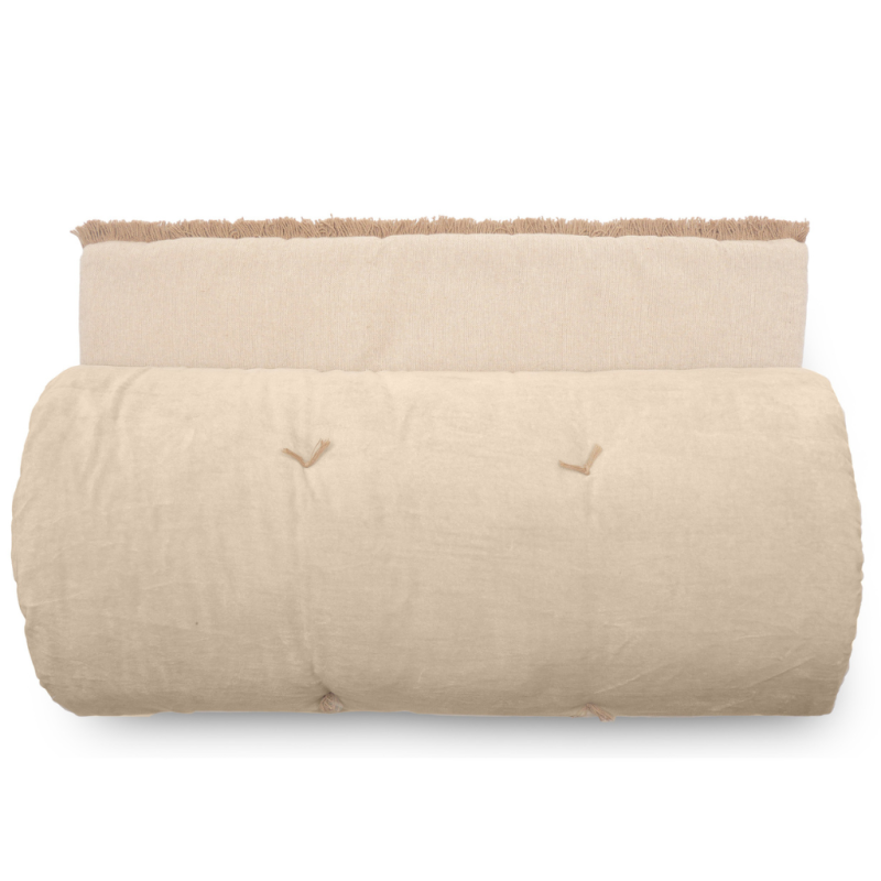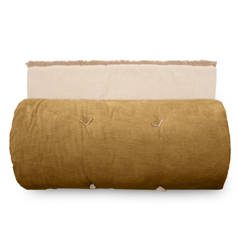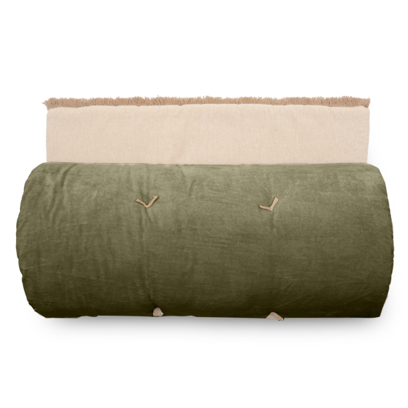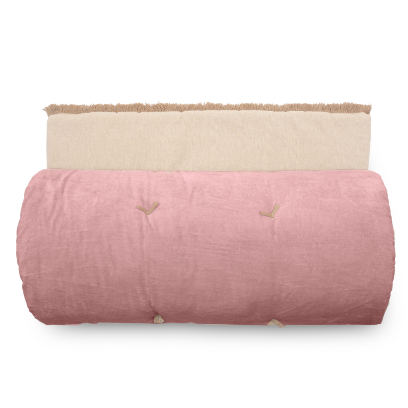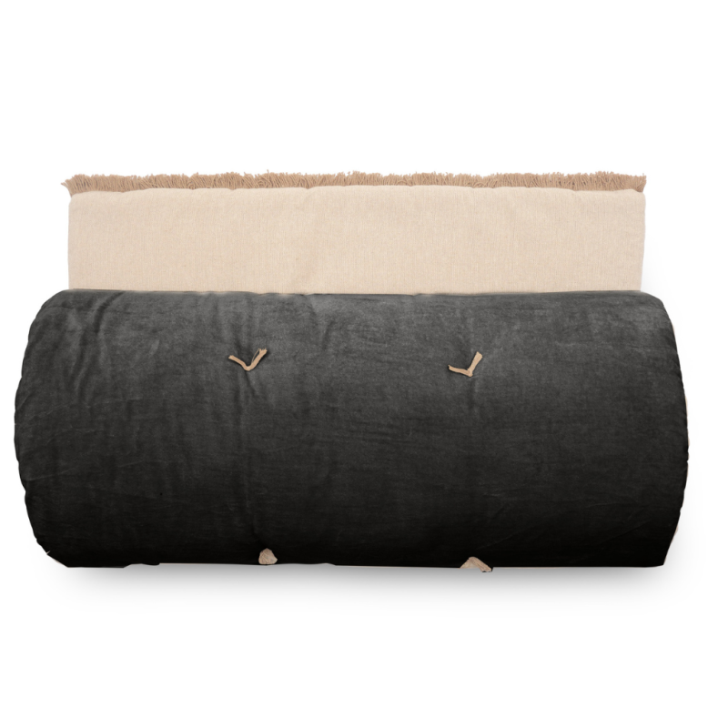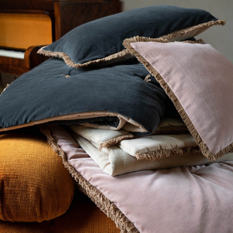 1 face en velours et l'autre face chambray coordonné finition franges de 2 cm.