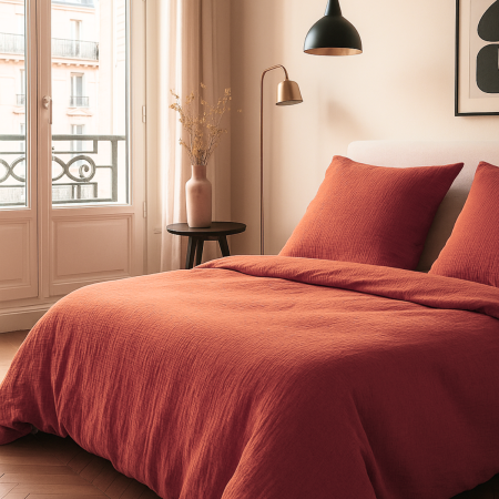 Housse de couette en gaze de coton – Teinture Garment Dye Plongez dans la douceur authentique et l’élégance naturelle de notre housse de couette en gaze de coton “garment dye” — un linge de lit d’exception, à la fois moderne et intemporel, imaginé pour sublimer vos nuits. Une matière aérienne et ultra-douce Confectionnée en double gaze de coton 100 %...