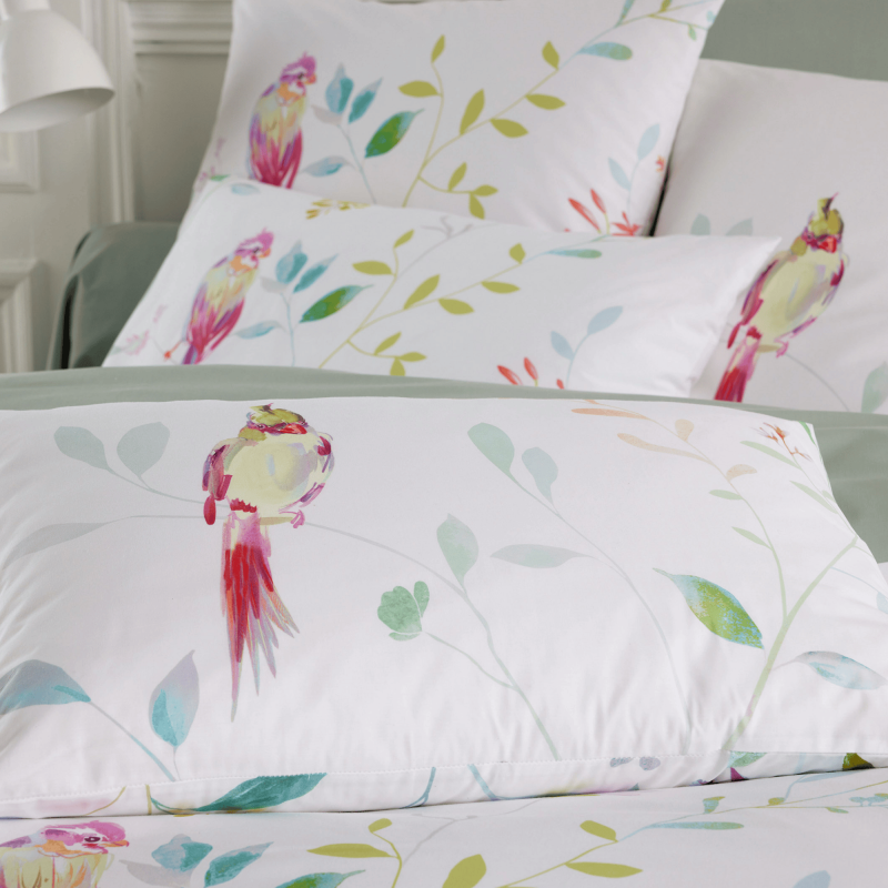 La Compagnie du Blanc vous présente le modèle Zephyr, une élégante parure de lit en percale de coton, inspirée de la nature exotique, où se mêlent feuillages luxuriants et oiseaux aux allures poétiques.