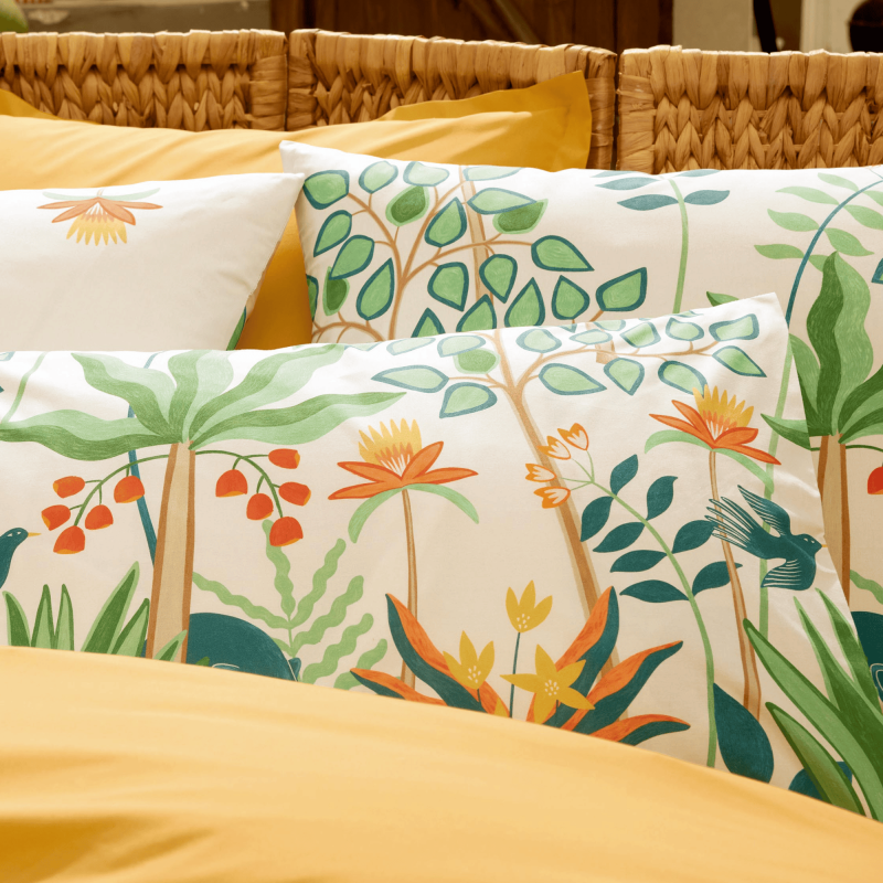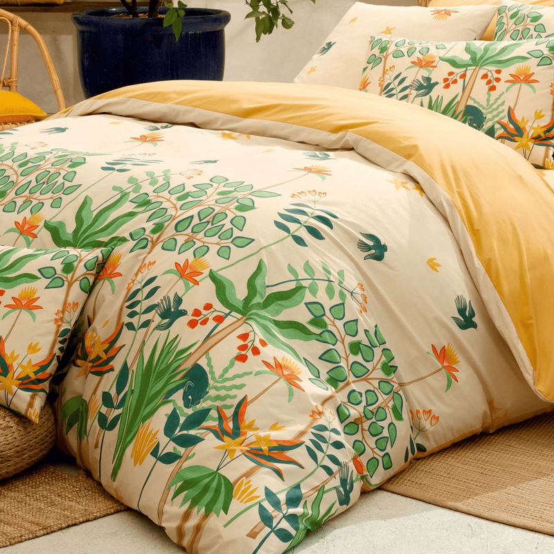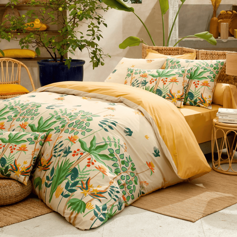 La parure Calypso est une housse de couette en percale de coton au charme exotique, sublimée par un imprimé inspiré de la jungle tropicale.
