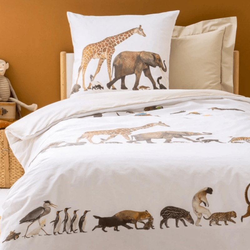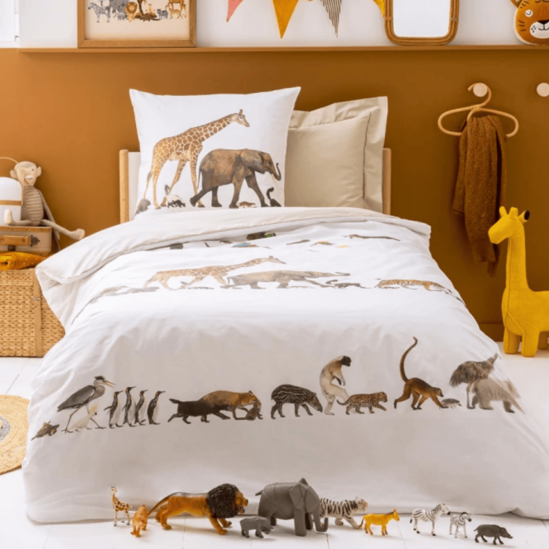 La parure de lit NOÉ, confectionnée en percale de coton, met en scène des animaux aux détails saisissants, avançant en file indienne dans une composition évoquant l’arche de Noé.
