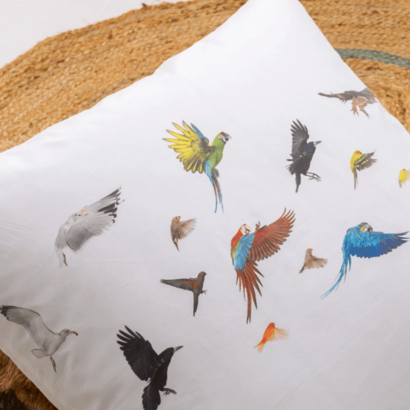 La taie d’oreiller est réversible : une face présente les animaux en file indienne, tandis que l’autre dévoile un envol d’oiseaux venus des quatre coins du monde.
