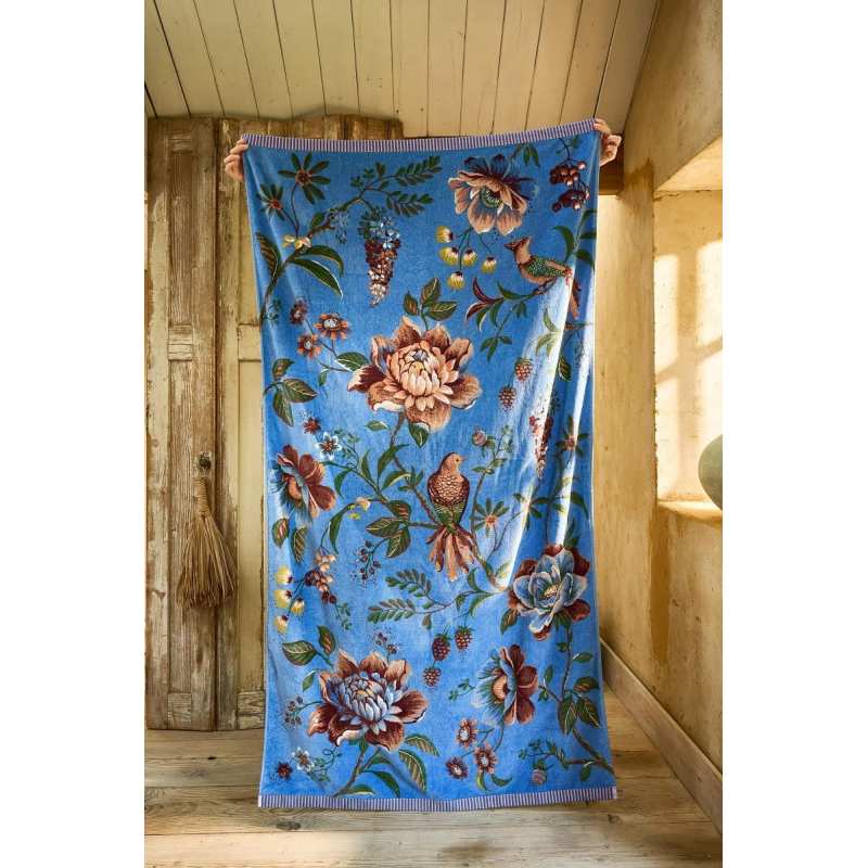 La serviette de plage Secret Garden présente de grandes pivoines colorées, accompagnées de fleurs imaginatives, de feuilles ainsi que de grappes de mûres et de baies. Des oiseaux paradisiaques se cachent entre les fleurs. La serviette est finie avec une bande contrastante tissée. Fabriquée en coton éponge de haute qualité, elle est douce, absorbante et offre une sensation de solidité.